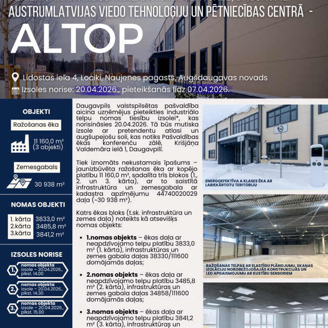 12 Izsludināta “ALTOP” industriālā parka ražošanas telpu nomas izsole