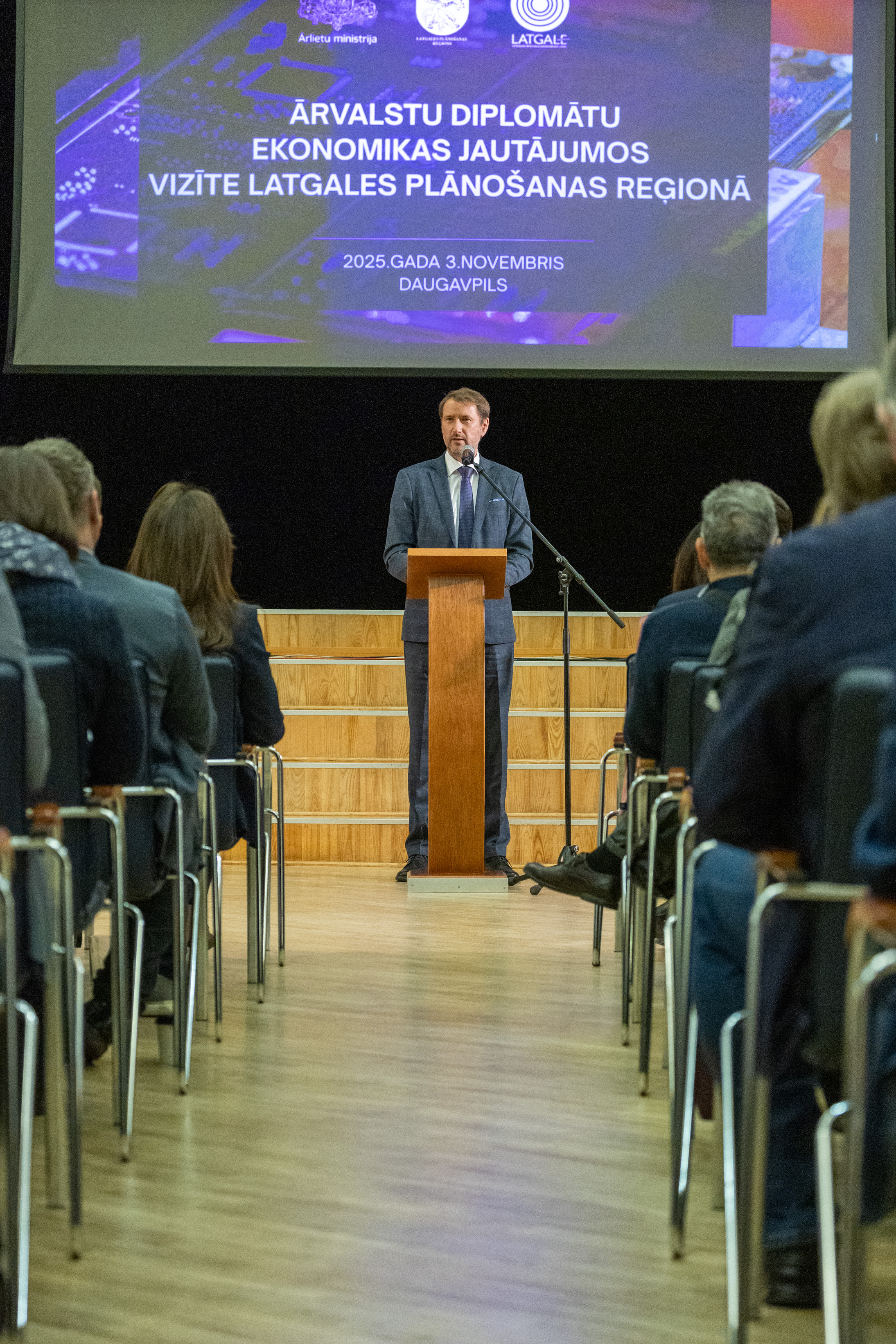 On 3 November 2025, foreign diplomats accredited in Latvia in the field of economic affairs, together with representatives and experts from the Ministry of Foreign Affairs, visited Daugavpils as part of a regional visit to Latgale. During a series of networking events, the delegation met with entrepreneurs, municipal leaders, representatives of economic zones, and other regional stakeholders.