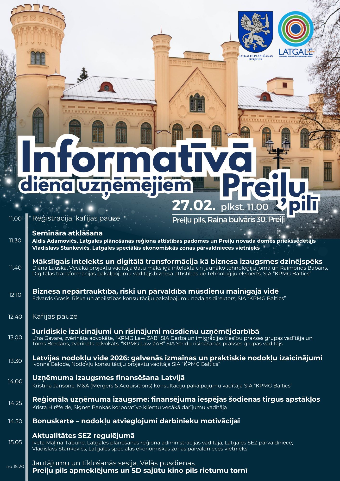 2026.gada 27. februārī atjaunotajā Preiļu pilī Latgales plānošanas reģions (LPR) un Latgales speciālās ekonomiskās zonas (Latgales SEZ) pārvalde organizēja Informatīvo dienu uzņēmējiem, pulcējot SEZ kapitālsabiedrības, nozares ekspertus un finanšu institūciju pārstāvjus.